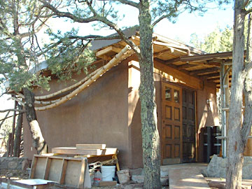 Bale Office First a storage shed, then a library, and now an office: oh, how projects change! This one has turned in to a really cool building. The foundation is a combination of existing railroad ties and purchased 8x8x16 concrete block. The stem walls are 3 yards of Tractor Cob with an exterior Torch Down (bitumen rubber) perimeter flashing membrane. Torch Down really comes in handy for construction grade flashing applications and works great for pond and stream liners. Many times you can find damaged rolls at the roofing supply companies for half the price of new; I always find it nice to have a few rolls on hand. The walls were constructed with 2 string, load bearing, bales on edge, with external bamboo pinning. More salvaged 2x4’s were used to construct the top plates. A center 6x6 beam was installed to support the fourteen 5-inch diameter vigas (round roof rafters). More 2x4’s on edge provided depth to the roof for a 6-inch layer of insulation before the metal R-panel roof (also purchased at half the cost of new) was applied. The roof slope is designed for an eventual living roof. After a 125-amp electrical sub panel, a stained concrete radiant heat floor, 3 fixed windows, 2 used wooden panel doors (one sliding), a couple tons of earthen plasters, and various bamboo and wood trim details, it only took us a year to complete this building. |