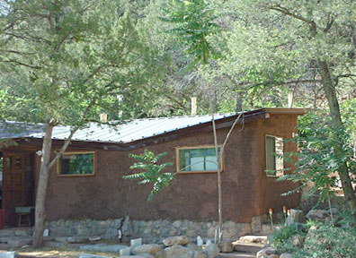 The Spotted Owl We used to call this building "The Wing". Now it's our "Spotted Owl" apartment. We created this strawbale living space from our former bamboo wing rack storage building. This tiny apartment, houses our bedroom, kitchen and bathroom all in total of 128 square feet. The exsisting recycled garage door steel frame and roof was raised, a concrete footing was poured then a concrete block and stone stemwall was motared up. Next the frame and roof were lowered and anchored down. We poured half of the floor in stained concrete with radiant heat pipe. The second half, under the bed, was left unheated and finished as an earthen floor. Three of the exterior walls were infilled strawbales while the north wall stayed as garage door panels but covered with bamboo pins and a rough earth plaster. The interior walls have our Kingston clay/straw earth plasters. The exterior walls will receive an earth/lime finish plaster. Finishing off the interior
