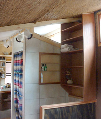 | Using a clever combination of recycled garage door track mixed with clay, masonry, tile, straw, wood and a lot of hard work our fifth building is almost complete. Except for the final exterior lime/earth plaster, Tom and Satomi’s “Spotted Owl” apartment is complete. As the saying goes, “were in”!!! First meal cooked in our kitchen. First steaming hot showers. The first load of laundry and most important, our first nights sleep at LanderLand. Exciting and strange to finally be living on our land and to be sleeping in our own straw bale building. Now it’s on to the next project, an adjoining sunroom. |